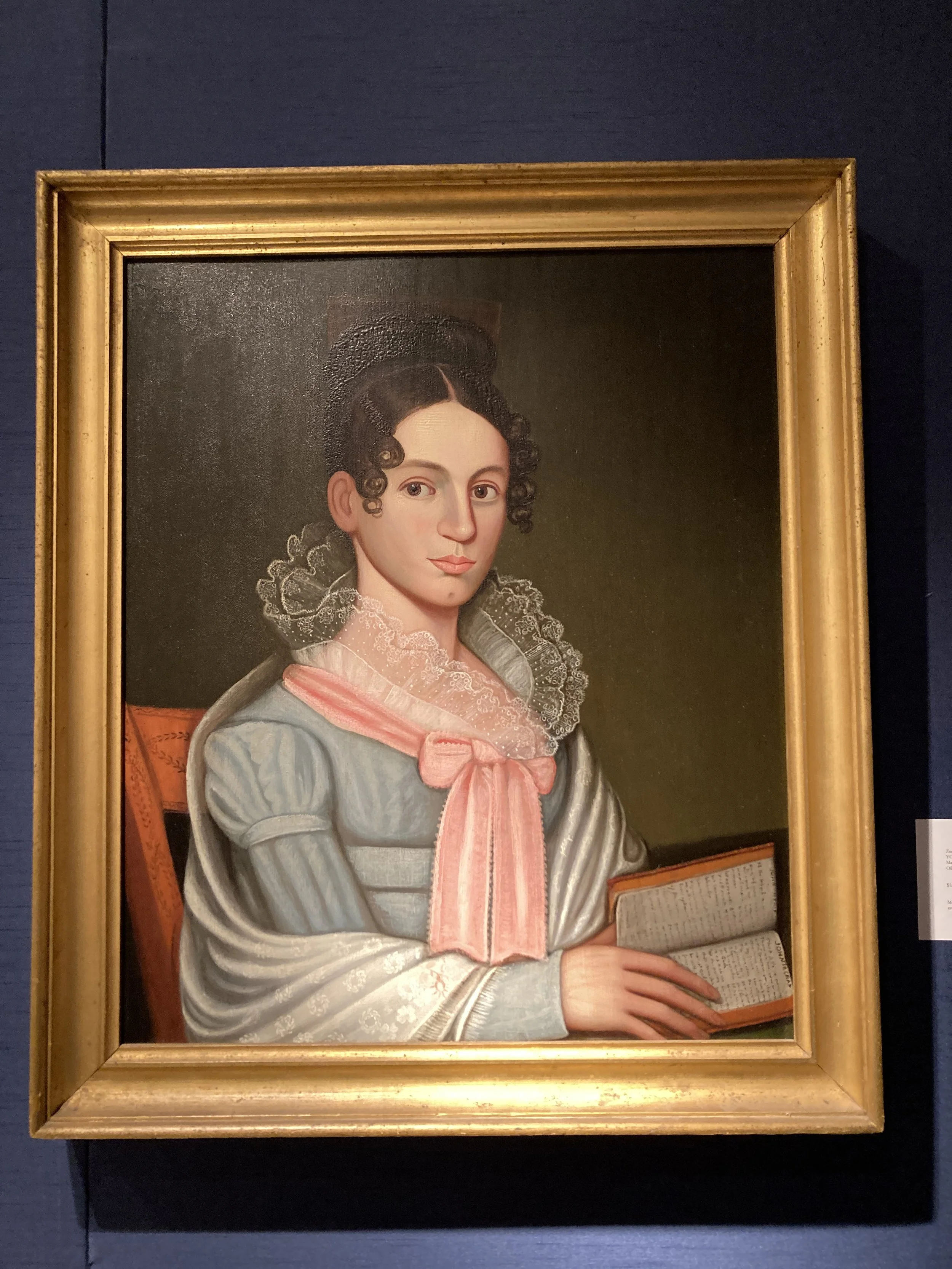 “Young Woman in Blue Dress with Pink Ribbons” by Zedeliah Belknap c. 1830. David A. Schorsch and Eileen M. Smiles