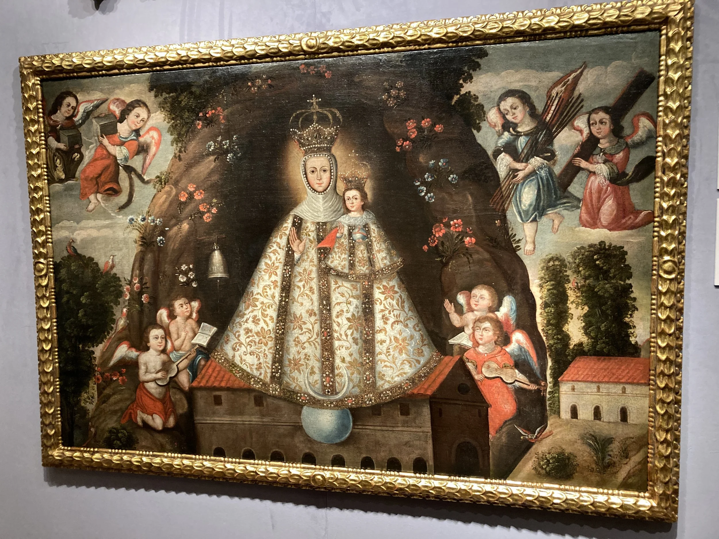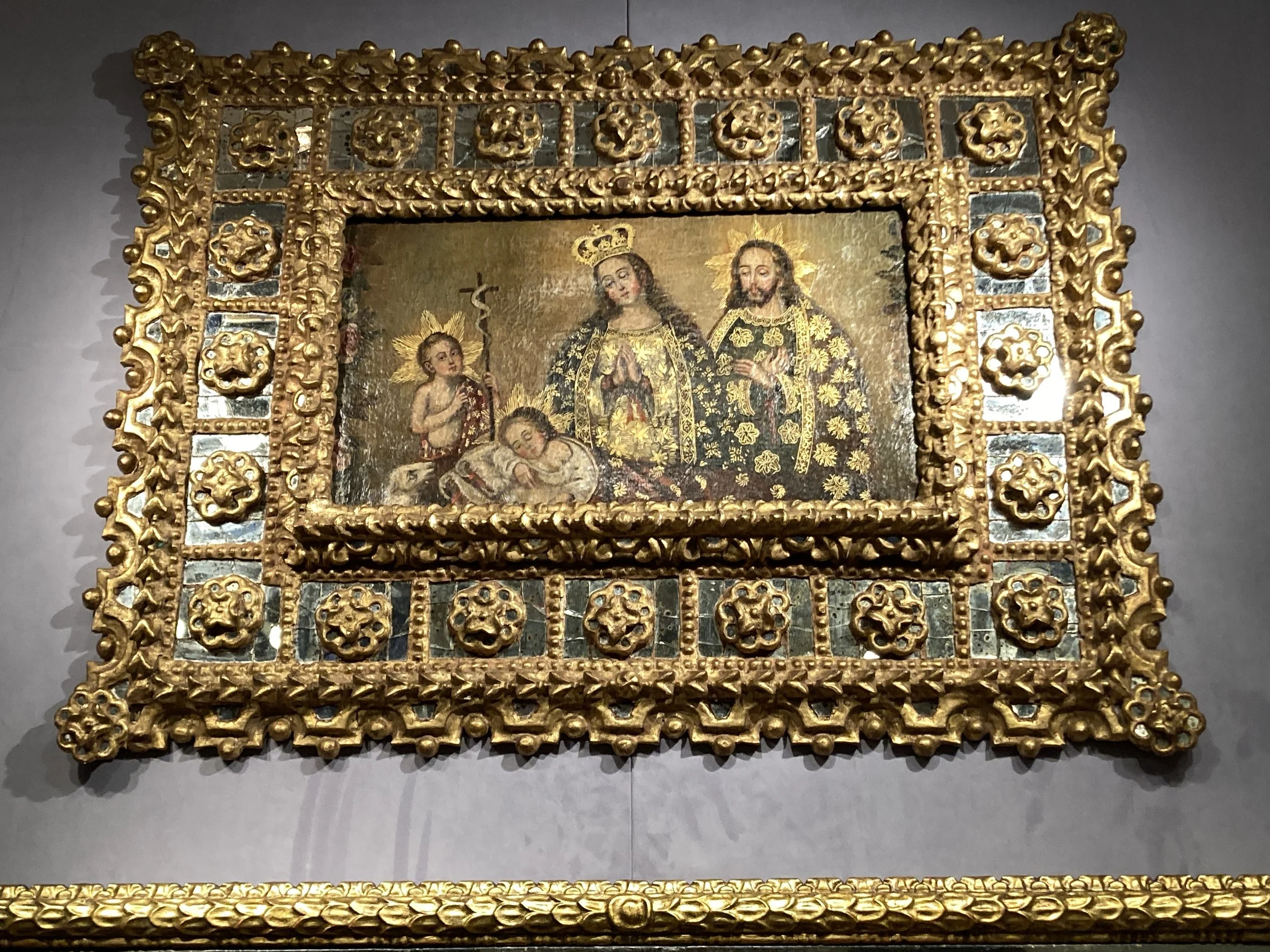 Directly above “The Virgin of Loreto” was this sparkly gilt wood and mirrored frame containing “The Holy Family and Young St John the Baptist Adoring the Sleeping Christ Child.” This also of the Peruvian, Cuzco School. Robert Simon Fine Art